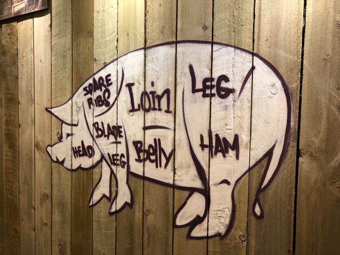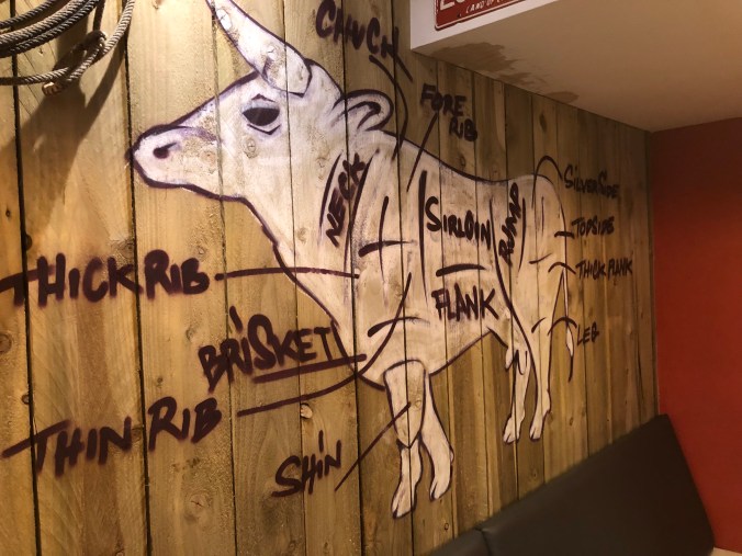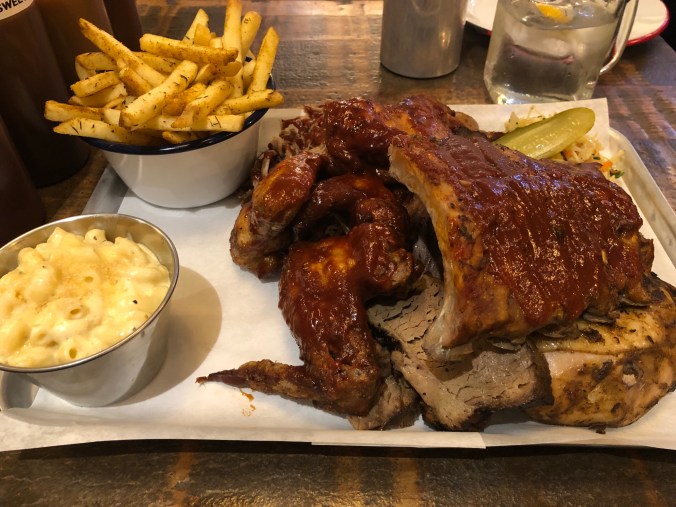 I ordered some kind of sampler platter, and I had no right doing that. I didn’t realize that this meant there would be about seven dead animals on the plate in front of me. The meat was really delicious, but their sauce wasn’t really smoky at all. It was a lot closer to ketchup than a good barbecue sauce.