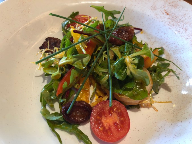 Dinner was at the hotel again. They have special where you pay one price for three courses. The first course was the salad with prawns and some kind of pepperoni in it. The main course was a chicken crepe with a cheese sauce and mushrooms. Dessert was a brownie sundae garnished with a tomato… yeah… a tomato- which I did eat. So I guess I can count it as “healthy”.